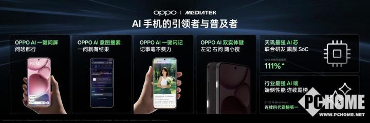 OPPO 作为 AI 手机领域的引领者与普及者,持续深耕系统级 AI 技术,先后推出 AI 一键问屏、AI 意图搜索、AI 一键闪记等功能,这些成果得益于 OPPO 与联发科联合研发的天玑 AI 芯强势驱动。新一代 Find X9 系列所搭载的天玑 9500,以 NPU 处理性能提升 111% 的超强算力,帮助 OPPO 打造行业性能最强 AI 端,并让 OPPO 旗舰成功在端侧AI 性能方面实现 ETHZ AI Benchmark 连续第四代霸榜第一,结合更流畅更智能的 ColorOS 16 系统,为用户带来新一代最强 AI 终端体验。