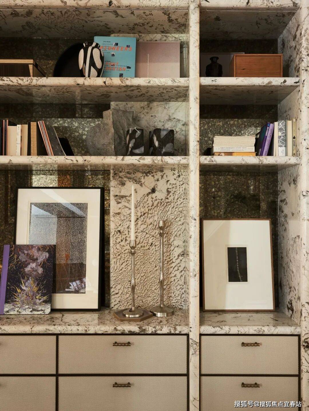 重要的构成部分,也是入户一眼定格的艺术角落,硬装使用弧形造型嵌套,柜体跟墙身饰面采用一体化的设计,让视觉焦点自然的被向内吸引。
