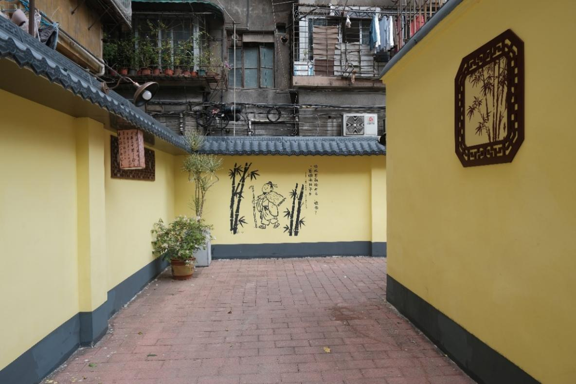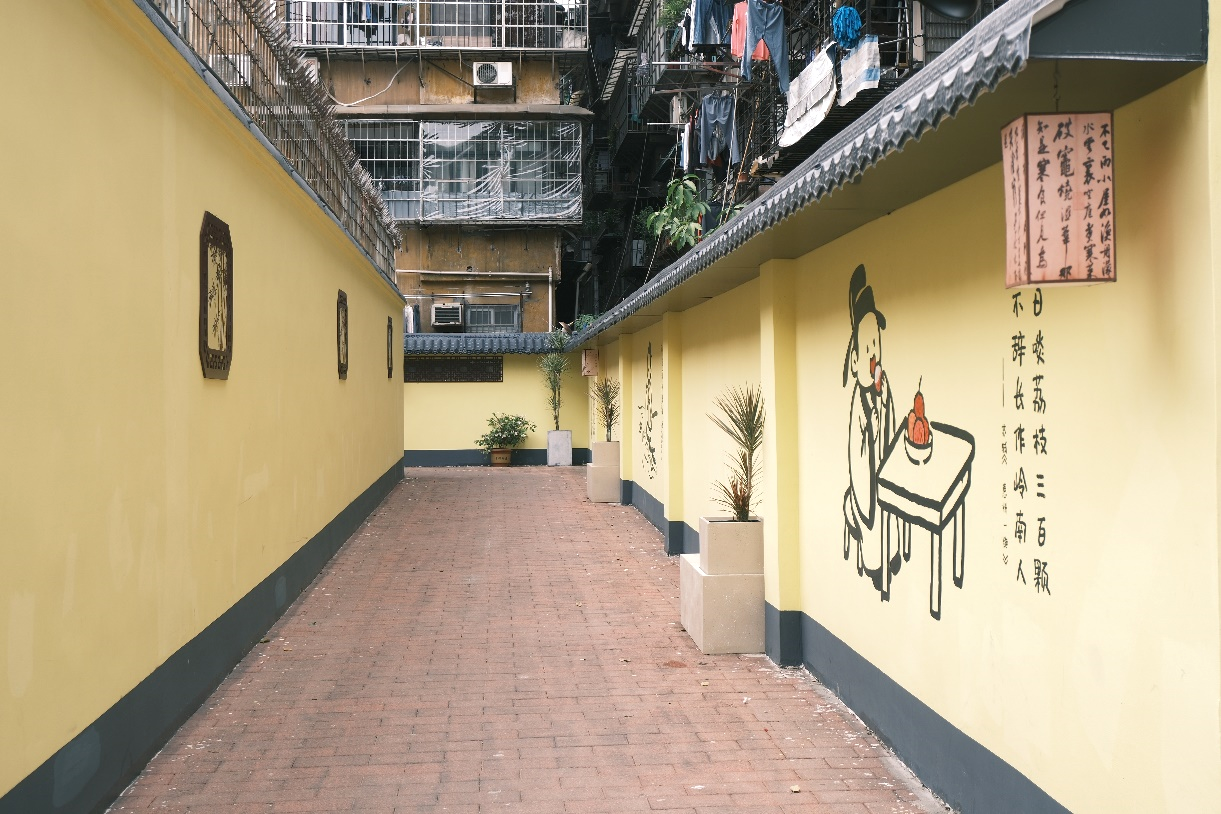 本次胜雨径提升亮点在于围墙改造,项目团队以苏轼豁达的人生观为主题,将其自黄州、儋州到广州所作的诗句生成对应场景,通过简笔彩绘方式融入巷墙的设计中。墙顶覆以树脂瓦,墙身饰以黄漆,并嵌岭南特色窗花,于古寺意境中融入当代设计语言。